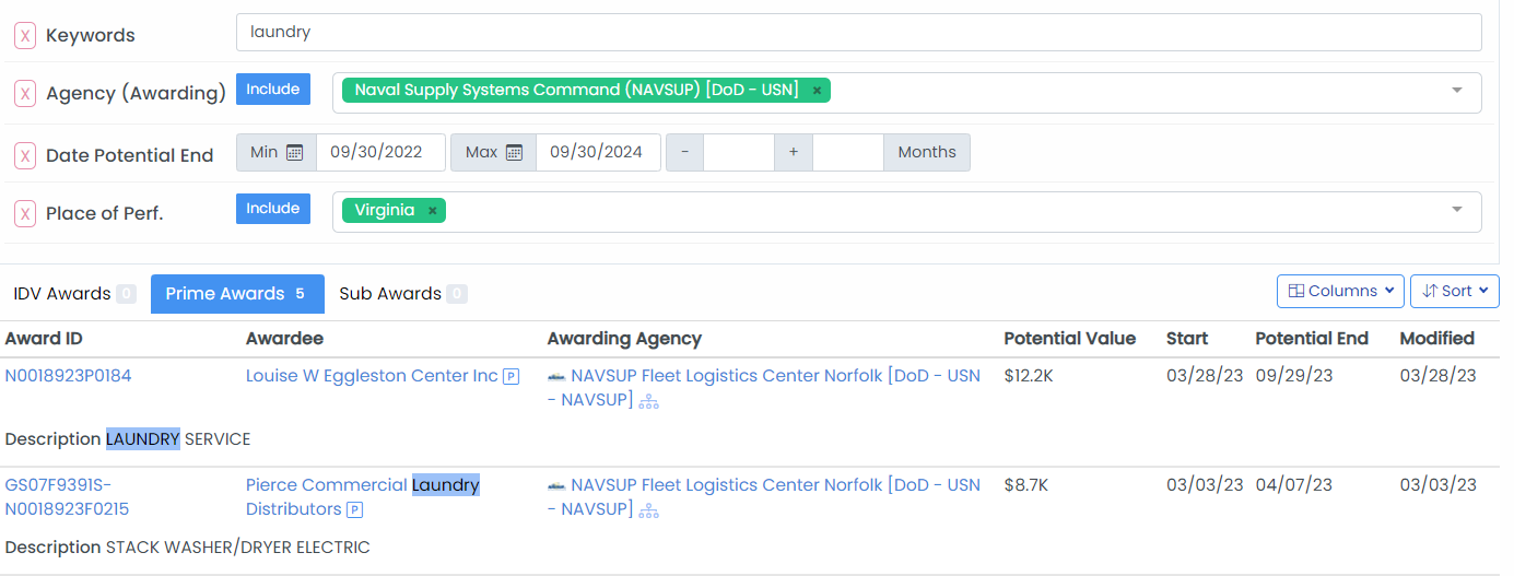 In some cases, it may make sense to also use **PSC** code or **Potential Value** as filters if there are too many results with the above filters.  Please see an example search using Date Potential End, Agency (Awarding), Place of Performance, and keywords [here](https://www.highergov.com/contract/?searchID=7Bpvih7aTWUMZ9sypkB8r#contract).